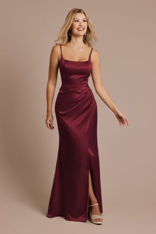 This square neck sheath dress combines elegance and edge. The corset-style bodice with a basque waist flatters your figure, while the silky satiny charmeuse flows into a sleek skirt. A side slit adds a touch of boldness, perfect for bridesmaids and special events.
