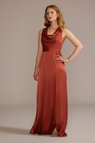 Made of satin-like stretch charmeuse fabric with a skirt slit, this sleeveless cowl-neck bridesmaid dress looks ready for the red carpet.